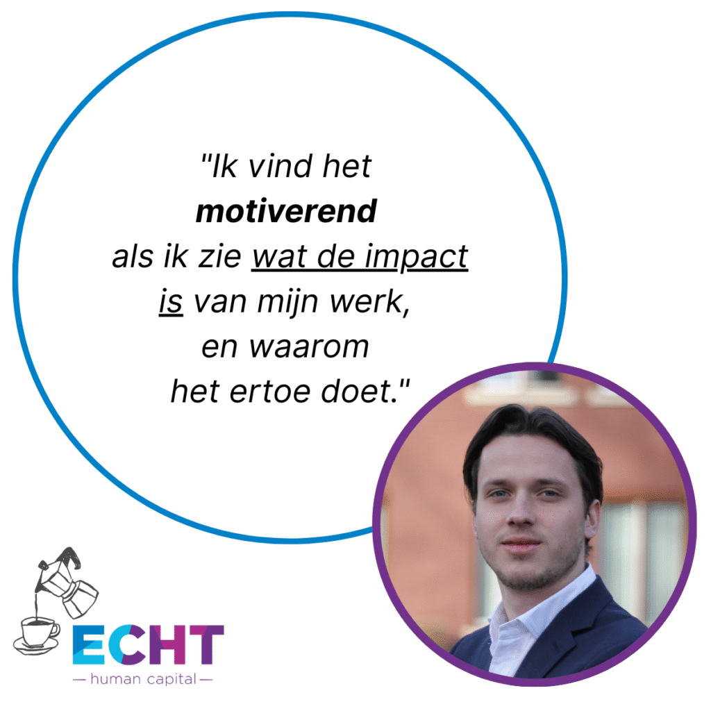 Tastbare resultaten! Ik vind het motiverend als ik zie wat de impact is van mijn werk, en waarom het ertoe doet. Het idee dat mijn werk bijdraagt aan maatschappelijke uitdagingen, zoals de energietransitie, geeft me een echt gevoel van zingeving.